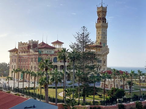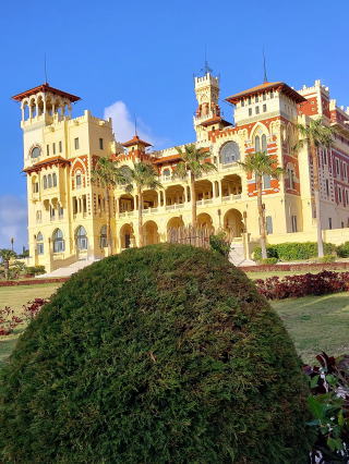 「モンタザ宮殿」(Montazah Palace) モンタザ宮殿は、エジプト・アレクサンドリアの地中海沿いに建つ王族の夏の離宮です。1892年に当時の皇太子アッバース・ヒルミー2世によって建てられ、美しいイタリアン・オスマン風の建築と広大な庭園が特徴です。 モンタザ・ガーデンは、宮殿を囲む広大な庭園で、豊かな緑と色とりどりの花々が魅力です。地中海の風を感じながら散策できる、平和で美しい空間で、湖や小道、噴水なども点在しています。自然と歴史が融合した場所です。