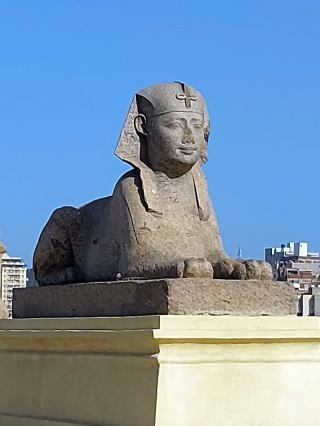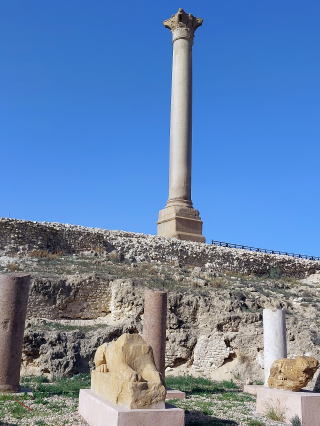 ポンペイの柱 紀元前3世紀頃のプトレマイオス朝時代に建てられた高さ27m、円周は8mもある巨大な柱。その前に小さなスフィンクスが1対座っています。図書館の400本の柱の一つで、エジプトの南部アスワンから持ってこられた という諸説があります。