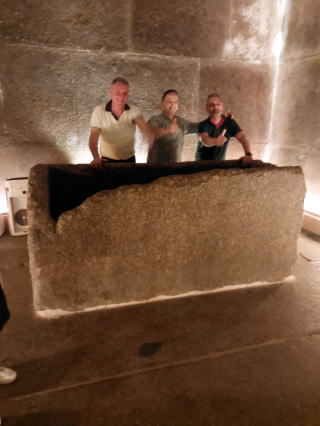 「大回廊」に出ると、視界が広がり、一息つきます。高さ8.5mの空間です。そこを過ぎると終点の「王の間」。端の方に、映像や写真で何度も見てきた石棺が置かれていました
