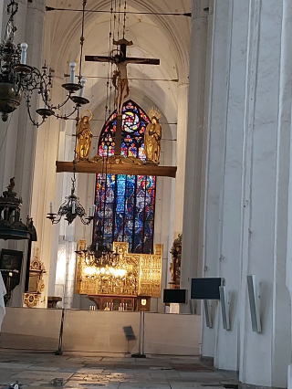 ハンス・メムリング作の「最後の審判」、石造りのピエタと呼ばれる「なげきの聖母像」や、アウグスゴルグ出身のミウ・シュパルツ作の祭壇は有名です。400段の石段を登れば尖塔最上階より素晴らしい眺めも見られます。