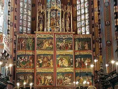 (写真上)ヴィート・シュトース作の祭壇画が、毎日午前11時50分に扉を開きます。現地 ガイドがその時間に案内してくれるのですが、皆考えることは同じで教会内部は大混雑でした。