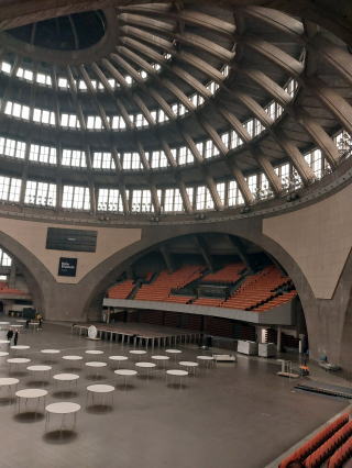 ここはローマの円形競技場をイメージしたドームを中心に左右対称の4つ葉形のスペースが作られたもの。直径69m、高さ42mという、世界最大の鉄筋コンクリートを使用したホール(当時)であり、先駆的な大型のモダニズム建築でした。これは現代建築にも繋がるも作品でもあります。