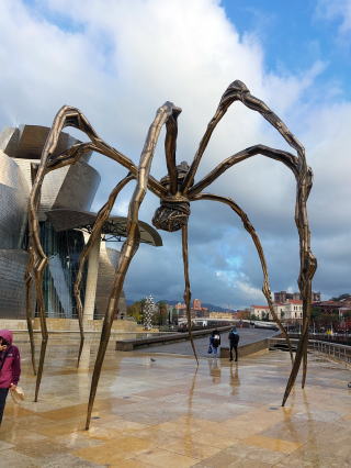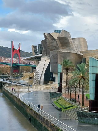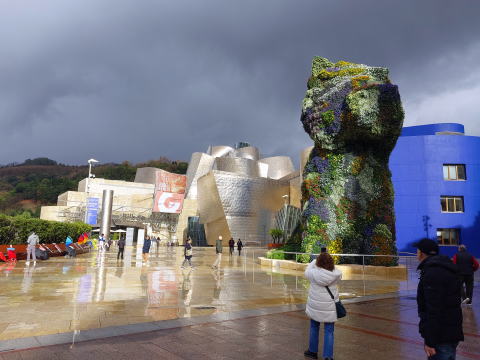 「グッゲンハイム美術館」(Museo Guggenheim)1125-131524* 142539 1997年、ビルバオの造船所があった川岸にモダンアートの発信地として開館した「グッゲンハイム美術館 Guggenheim Museum Bilbao」。ニューヨークに拠点を置くグッゲンハイム美術館の分館として建てられました。アメリカの建築家フランク・ゲーリーが設計した革新的な建物は、現代建築において高く評価されています。外壁には魚の鱗のようなパネルが設置されており、光を反射して建物の表情は刻々と変化しています。また大きな明るいアトリウムを中心に設計された内部からは、ビルバオの河口や山並が見渡せます。