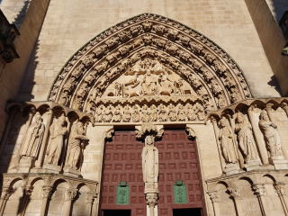 世界遺産ブルゴス大聖堂の北交差廊の入り口に「ポルタダ・デ・ラ・コロネリア」とよばれる彫刻があります。これはキリストの最後の審判を彫刻で表したもので、中央にはイエスキリスト、左には聖母マリア、右側には洗礼者ヨハネが並んでいます。下にはキリストの使途が12人、福音書を手に並んでいる像がありますが、ゴシック様式独特の細かい装飾が美しく、スペインの歴史的にもとても価値がある作品となっています。
