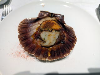 | 写真(上および1段目)はゲタリアの炭火焼き 発泡酒チャコリ(txakoli)(写真2段目左) スペイン北部、ピレネー山脈の西に位置するバスク州で造られるチャコリは、アルコール度数が低く、フレッシュで爽やかな酸味とミネラル感が特徴のワインです。 チャコリは白ワインが多く造られていますが、実は赤とロゼも造られています。さらに、フレッシュさを楽しむために炭酸ガスを残して瓶詰めした微発泡タイプと、非発泡のスティルタイプの2種類があります。一般的に知られているのは微発泡のフレッシュタイプのチャコリで、10月末~11月に収穫されたブドウが、その年の12月~翌年の1月にはワインとなってワイナリーからリリースされます。アルコール度数が低く、フレッシュで爽やかな風味を収穫から1年ぐらいまでに楽しむのがおすすめです。 リオハワイン(rioja)(写真2段目右) リオハの名前の由来はエブロ河の支流オハ川(リオ・オハ)です。この辺りでは古代ローマ人が支配する前の時代からワイン造りが始まっていて大変古い歴史があります。しかし産業としてワイン造りが発達したのは19世紀末のことです。1850~60年代にフランスで発生したフィロキセラ(ブドウ害虫)禍期に、とくに被害のひどかったフランスのボルドー地方から多くの生産者や業者がリオハに流入しました。スペイン貴族たちとボルドーに交流があったことや、リオハがボルドーと地理的に比較的近かったことが背景にあります。 ホタテのガリシア風オーブン焼き(Vieras a la Gallega)(写真3段目左) ホタテを開き、その中にあるウロ(中腸腺)を取り除き、洗って砂を落とします。同時に玉ネギとニンニクの皮をむいて細かく刻み、オリーブオイルをひいたフライパンで炒めます。続いてスイートパプリカとワインを加えます。少し小さくなったら、炒めたトマトを入れて味付けします。最後に、貝に入ったホタテをオーブンに入れて焼き、炒め物を上に載せ、パンくずとパセリをまぶします。オリーブオイルをまぶして、できあがりです。 プルポ・ア・フェイラ(タコのパプリカがけ) (Pulpo a Feira) (写真3段目右) ガリシア地方の伝統的な料理である「プルポ・ア・フェイラ」は、柔らかく茹でたタコをシンプルな調味料で味付けし、オリーブオイルとパプリカを添えて提供する一品です。 ポルボ・ア・フェイラは伝統的にパンや薄くスライスした茹でジャガイモ (ガリシア語: cachelos) とともに木の皿で供される。伝統では、タコを食べるときに水を飲んではいけないことになっているため、この料理はガリシア産赤ワインの若いものと食べるのが一般的である。また、地域によっては衛生上の理由から伝統的な木の皿が見られなくなっていたり、玉ねぎとピーマンのみじん切りを炒めたものを添えるなどレシピに多少の変化があったりすることもある。 バルの小料理 パラドールのディナー |