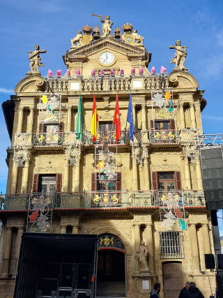 毎年7月6日の正午、牛追い祭りことサン・フェルミン祭はこちらのパンプローナ市庁舎から始まります。サン・フェルミン祭の時期になるとニュースでも世界中の人たちが目にするこの美しい市庁舎は、パンプローナを代表する名所として多くの観光客が訪れています。