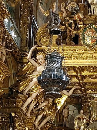 この香炉の大きさは1.5メートル、重さは53kgもあるので、動かすには8人の男性が必要です。(この役を担う人は『ティラボレイロス』と呼ばれる)この滑車は高さ20mからつり下げられ、(儀式中には吊るされた状態で)かなり高速で行き来します。